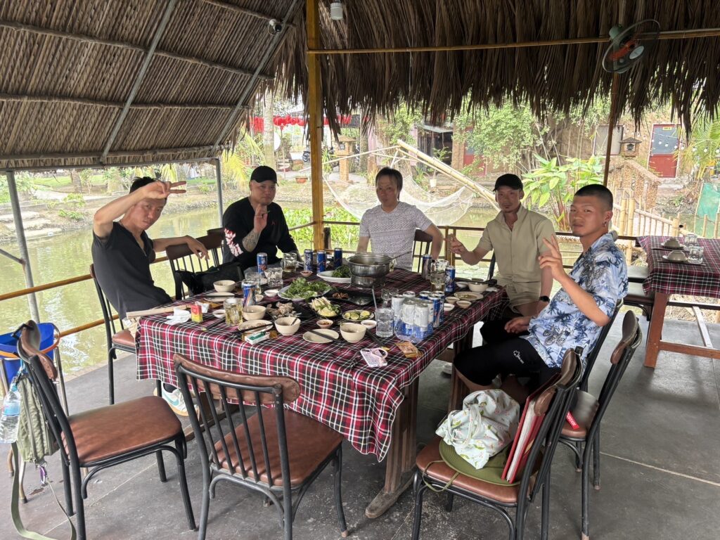 水辺に面した雰囲気の良いレストランで、ベトナム料理を楽しみました。茅葺き屋根の開放的な空間で、新鮮な野菜や魚介を使った料理を囲みながら、社員同士の会話も弾みました。普段とは違う環境での食事は、特別な思い出となりました。